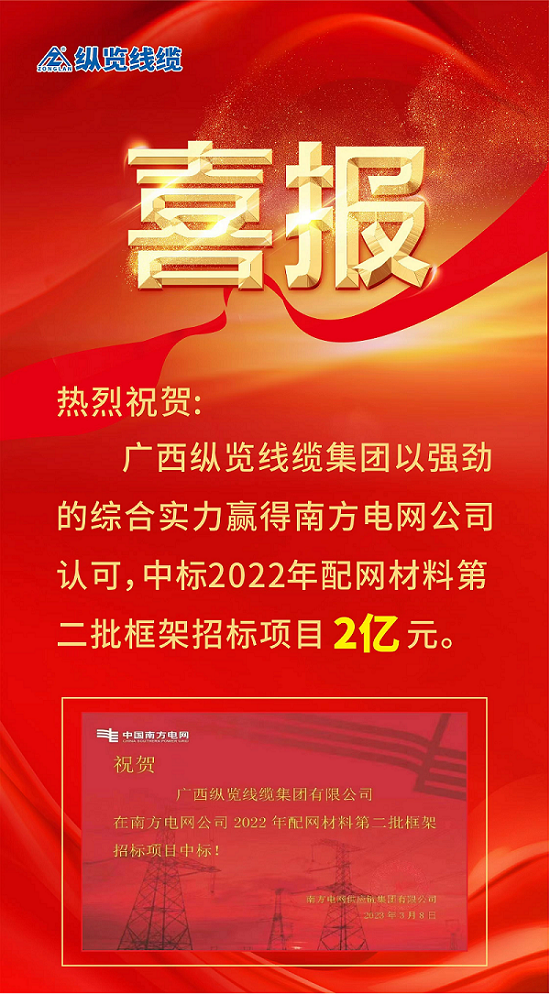 日前,在南方電網公布的2023年第一季度線纜采購中標企業(yè)名單中,縱覽線纜集團斬獲南方電網2022年配網材料第二批框架項目訂單約2億元,是廣西線纜行業(yè)唯一中標企業(yè)。 縱覽線纜集團作為中國線纜行業(yè)最具競爭力100強企業(yè)、廣西工業(yè)龍頭企業(yè),已服務電網建設19年,成為南方電網核心供應商。未來,我們將深入實施“服務電網、走進萬家”發(fā)展戰(zhàn)略,認真踐行做好產品回報客戶,做好企業(yè)回報社會的使命初心,不斷加強自身能力建設,在持續(xù)高質量、高水平服務好國家電網建設的同時,向廣大人民群眾提供更安全、節(jié)能、環(huán)保的高性價比優(yōu)質產品,用服務電網的技術能力和高品質的產品全力支持地方工程建設,為廣西工業(yè)振興、強首府戰(zhàn)略的深入作出新的更大貢獻! |