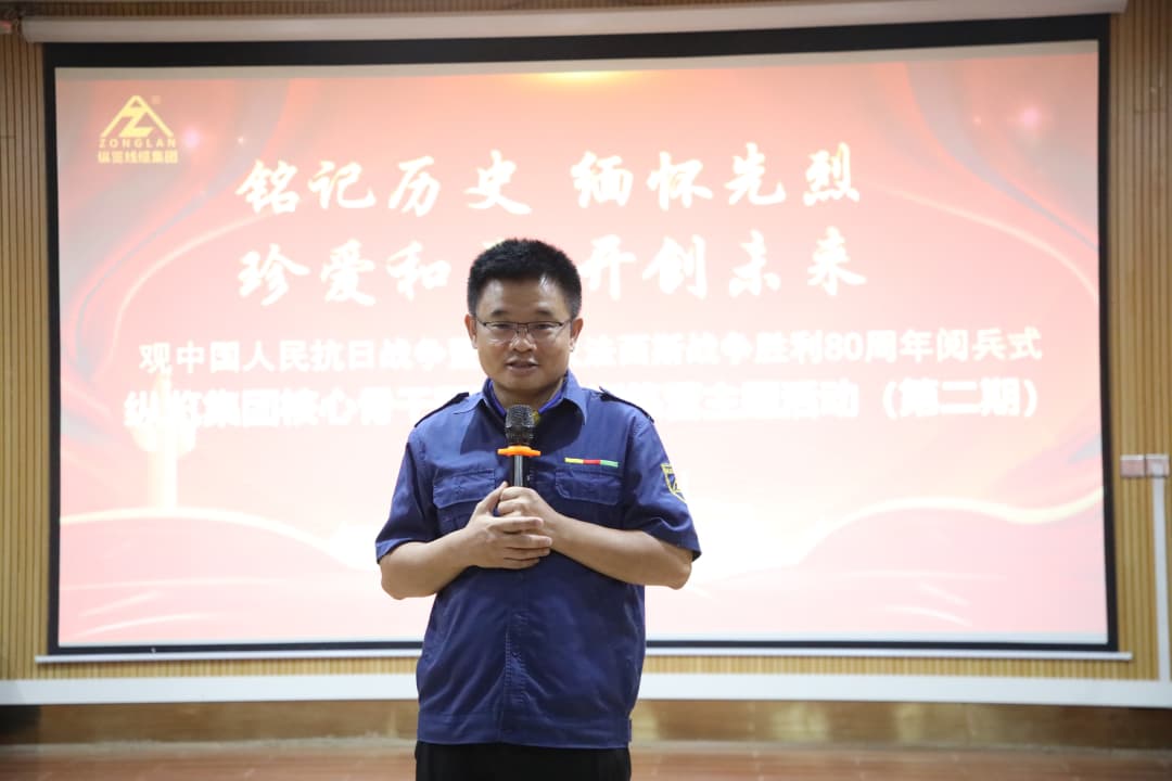 在中國(guó)人民抗日戰(zhàn)爭(zhēng)勝利80周年之際,偉大抗戰(zhàn)浩氣凜然,精神弘揚(yáng)至關(guān)重要。9月3日,縱覽集團(tuán)組織公司全體核心骨干集中觀看中國(guó)人民抗日戰(zhàn)爭(zhēng)暨世界反法西斯戰(zhàn)爭(zhēng)勝利 80 周年閱兵儀式作為一次愛國(guó)愛黨思政教育培訓(xùn)活動(dòng)。旨在引導(dǎo)公司核心骨干銘記歷史、珍愛和平、開創(chuàng)未來(lái),傳承弘揚(yáng)浴血奮斗鑄就的偉大抗戰(zhàn)精神,從歷史榮光與國(guó)防力量中汲取精神養(yǎng)分,強(qiáng)化核心骨干團(tuán)隊(duì)的使命擔(dān)當(dāng)與奮斗精神,將愛國(guó)情懷轉(zhuǎn)化為推動(dòng)企業(yè)高質(zhì)量發(fā)展的實(shí)干動(dòng)力,用偉大的抗戰(zhàn)精神和閱兵儀式中所展示的國(guó)家實(shí)力與民族自信心激勵(lì)公司骨干發(fā)揮表率作用在踐行“做好產(chǎn)品回報(bào)客戶、做好企業(yè)回報(bào)社會(huì),做最好的線纜”初心使命。集團(tuán)董事長(zhǎng)陳秀銳、總經(jīng)理陳思行出席并講話,常務(wù)副總經(jīng)理陳思源,副總經(jīng)理吳培軍、陳楊、張彩菊,總工程師劉小祥出席活動(dòng)。