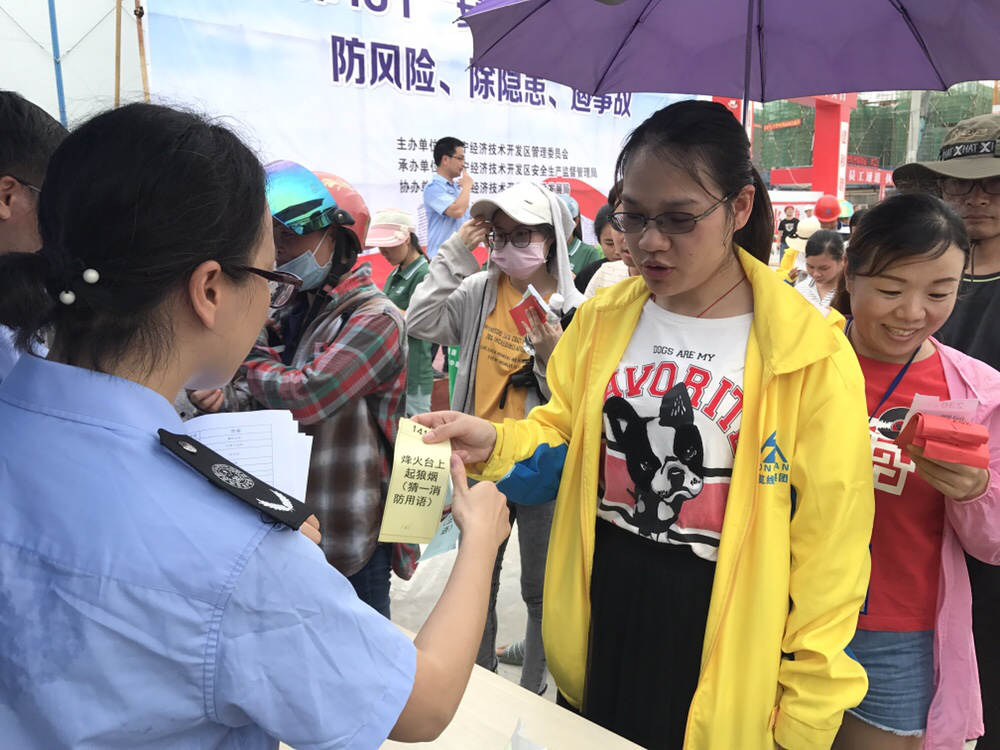 南寧經(jīng)濟(jì)開(kāi)發(fā)區(qū)“安全生產(chǎn)活動(dòng)月”正式啟動(dòng) 2019年6月14日下午15時(shí)15分,南寧市經(jīng)濟(jì)開(kāi)發(fā)區(qū)“安全生產(chǎn)活動(dòng)月”啟動(dòng)儀式在南寧市經(jīng)濟(jì)開(kāi)發(fā)區(qū)金凱路玖譽(yù)城舉辦。 此次活動(dòng)由南寧經(jīng)濟(jì)開(kāi)發(fā)區(qū)管理委員會(huì)主辦,南寧市經(jīng)濟(jì)開(kāi)發(fā)區(qū)安全生產(chǎn)監(jiān)督管理局承辦,南寧經(jīng)濟(jì)開(kāi)發(fā)區(qū)建設(shè)發(fā)展局、龍光工程建設(shè)有限公司協(xié)辦。 廣西縱覽線纜集團(tuán)有限公司組織員工參加本次啟動(dòng)儀式,啟動(dòng)儀式結(jié)束后現(xiàn)場(chǎng)進(jìn)行了安全知識(shí)燈謎活動(dòng),縱覽集團(tuán)各部門(mén)員工積極踴躍參與并贏得獎(jiǎng)品。 領(lǐng)取安全燈謎 回答燈謎問(wèn)題