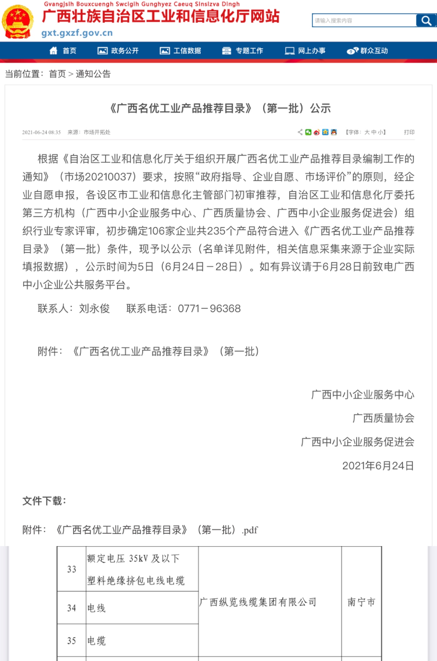 日前,在廣西工業(yè)和信息化廳公示的第一批次的《廣西名優(yōu)工業(yè)產(chǎn)品推薦目錄》企業(yè)產(chǎn)品名單中,廣西縱覽線纜集團(tuán)全系列產(chǎn)品以廣西線纜行業(yè)企業(yè)前列的成績(jī)上榜。 廣西工信廳組織編制《廣西名優(yōu)工業(yè)產(chǎn)品推薦目錄》工作,評(píng)選一批廣西優(yōu)質(zhì)工業(yè)產(chǎn)品,是貫徹落實(shí)全區(qū)工業(yè)振興大會(huì)精神及二季度推進(jìn)工業(yè)振興措施工作要求,幫助廣西工業(yè)企業(yè)進(jìn)一步提高產(chǎn)品競(jìng)爭(zhēng)力和企業(yè)綜合實(shí)力,提振廣西工業(yè)品牌的一項(xiàng)重要工作舉措。入圍企業(yè)代表著廣西工業(yè)各行業(yè)的標(biāo)桿水平。 |