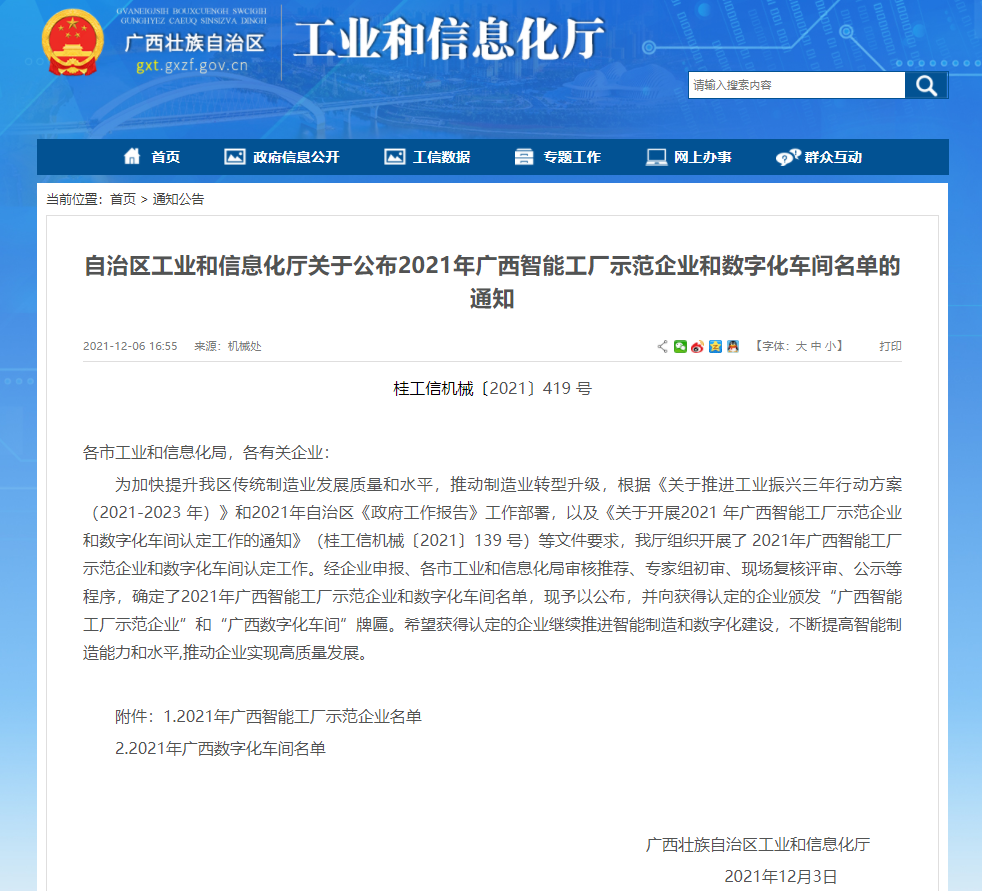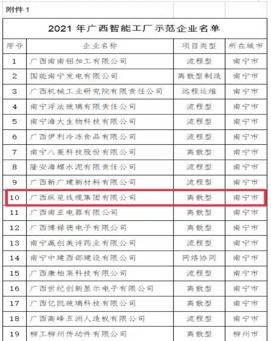 12月3日,自治區(qū)工業(yè)和信息化廳發(fā)布了關(guān)于公布2021年廣西智能工廠(chǎng)示范企業(yè)和數(shù)字化車(chē)間名單的通知,我集團(tuán)成功入選2021年廣西智能工廠(chǎng)示范企業(yè)名單,獲得“廣西智能工廠(chǎng)示范企業(yè)”榮譽(yù)稱(chēng)號(hào)。標(biāo)志著縱覽線(xiàn)纜集團(tuán)生產(chǎn)制造、產(chǎn)品質(zhì)量把控能力和水平邁上一個(gè)新的臺(tái)階,市場(chǎng)競(jìng)爭(zhēng)力進(jìn)一步增強(qiáng)。 |