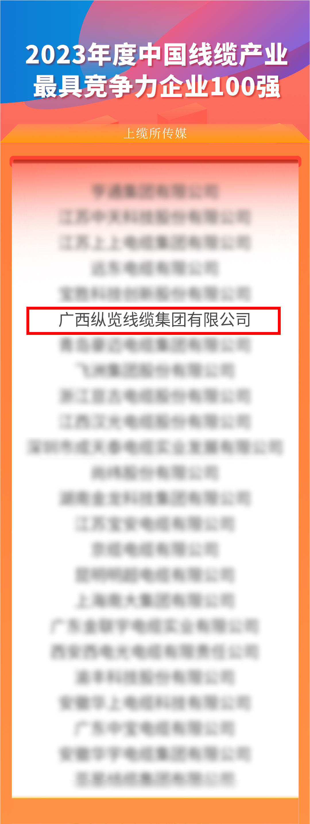 9月3日,由電線電纜網(wǎng)和線纜世界聯(lián)合主辦的“2023年度中國線纜產業(yè)最具競爭力企業(yè)”頒獎典禮在上海隆重發(fā)布??v覽線纜集團作為廣西工業(yè)龍頭企業(yè)再次榮登“2023年度中國線纜行業(yè)最具競爭力企業(yè)100強”榜單,至此已連續(xù)5年上榜。 中國線纜產業(yè)最具競爭力企業(yè)評測活動通過對全國近萬家線纜企業(yè)的規(guī)模、企業(yè)效益、研發(fā)創(chuàng)新、品牌知名度等多個維度進行分析評價,評選出上榜企業(yè),榜單極具專業(yè)性、權威性和公信力。 再次獲得此榮譽,既是肯定,也是鞭策。未來,縱覽線纜集團將持續(xù)秉承“做好產品回報客戶,做好企業(yè)回報社會”的使命愿景,在“服務電網(wǎng)、走進萬家”發(fā)展戰(zhàn)略引領下勇毅前行,持續(xù)提升品牌形象、科研能力、產品質量等綜合實力,為助推線纜行業(yè)高質量發(fā)展貢獻縱覽力量。 |