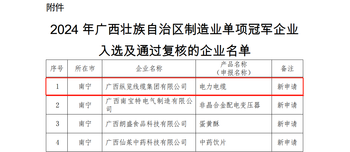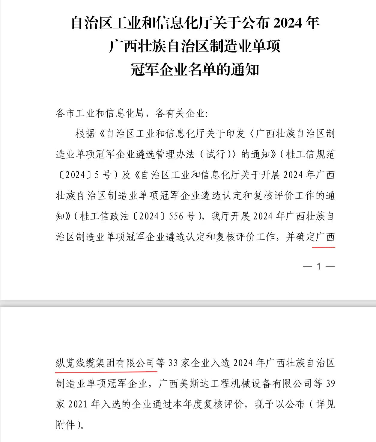近日,自治區(qū)工業(yè)和信息化廳正式公示2024年自治區(qū)制造業(yè)單項(xiàng)冠軍企業(yè)名單,其中涉及多個(gè)當(dāng)下熱門的制造業(yè)創(chuàng)新領(lǐng)域,經(jīng)過遴選和復(fù)核評(píng)價(jià)工作,廣西縱覽線纜集團(tuán)有限公司憑借卓越的綜合企業(yè)實(shí)力,被授予2024年【廣西壯族自治區(qū)制造業(yè)單項(xiàng)冠軍企業(yè)】稱號(hào)! 據(jù)悉,自治區(qū)制造業(yè)單項(xiàng)冠軍的評(píng)選,目的在于激勵(lì)和表彰在制造業(yè)領(lǐng)域具有顯著技術(shù)創(chuàng)新能力和市場競爭力的企業(yè)。評(píng)選過程中,專家組對(duì)參評(píng)企業(yè)的技術(shù)實(shí)力、產(chǎn)品創(chuàng)新能力、市場表現(xiàn)等多個(gè)維度進(jìn)行全面評(píng)估,最終評(píng)選出了包括廣西縱覽線纜集團(tuán)有限公司在內(nèi)的33家企業(yè)為單項(xiàng)冠軍企業(yè)。 此次獲得單項(xiàng)冠軍的榮譽(yù),對(duì)縱覽線纜集團(tuán)而言,既是對(duì)其過往努力的肯定,亦是對(duì)其未來發(fā)展的激勵(lì)。展望未來,集團(tuán)將致力于發(fā)揮制造業(yè)單項(xiàng)冠軍企業(yè)的示范與引領(lǐng)作用,持續(xù)秉承以“做好產(chǎn)品回報(bào)客戶,做好企業(yè)回報(bào)社會(huì)”的企業(yè)使命,堅(jiān)持以技術(shù)創(chuàng)新為核心,不懈努力提升產(chǎn)品質(zhì)量與服務(wù)水平,致力于為用戶提供更加優(yōu)質(zhì)、高效的電線電纜產(chǎn)品和服務(wù)。此外,公司亦將積極投身于行業(yè)內(nèi)的交流與合作,為推動(dòng)行業(yè)高質(zhì)量發(fā)展蓄勢(shì)賦能。 |