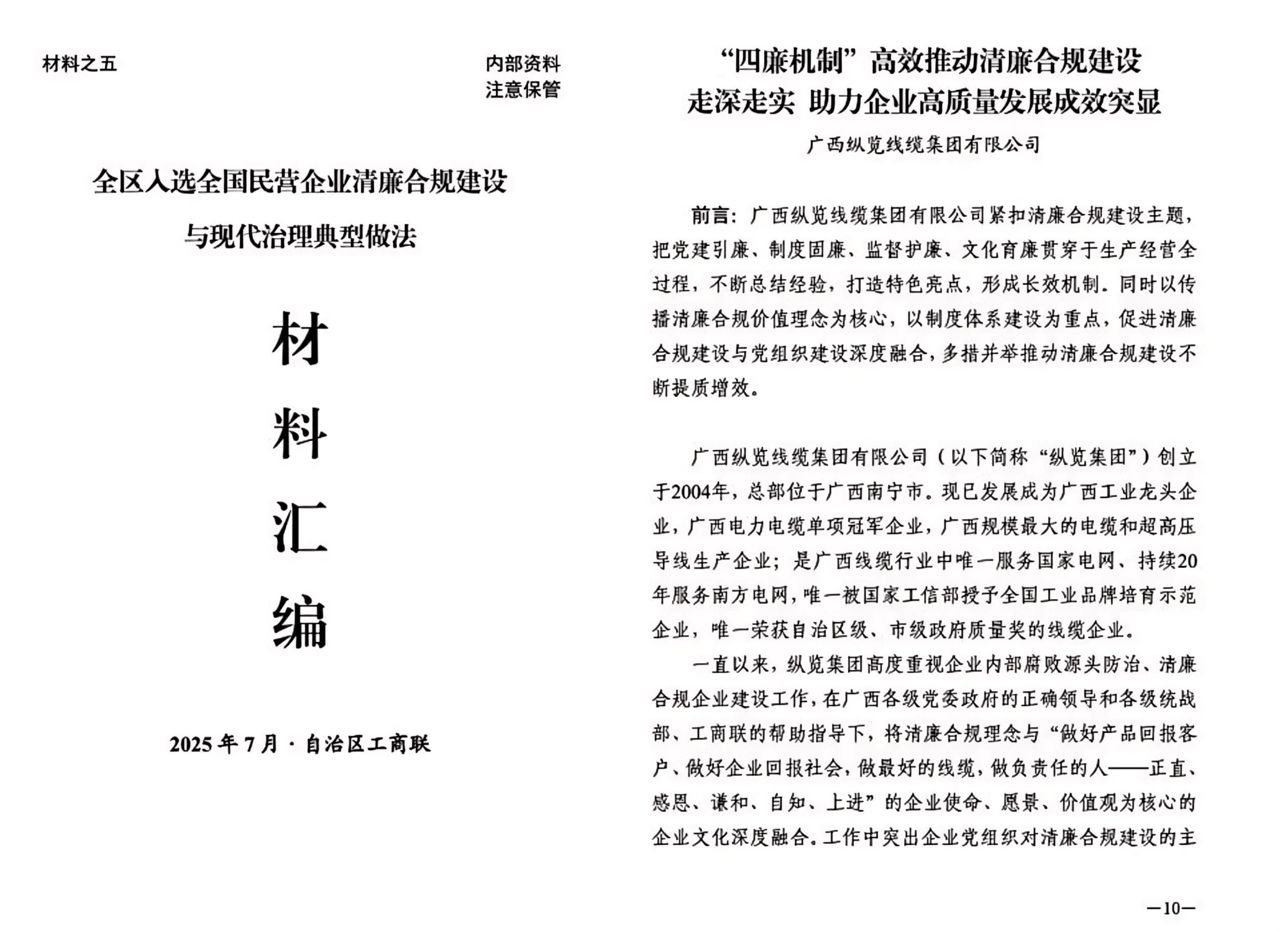 7月14-15日,2025年全區(qū)清廉民企建設(shè)提質(zhì)增效現(xiàn)場推進(jìn)活動(dòng)暨民營企業(yè)建立完善中國特色現(xiàn)代企業(yè)制度試點(diǎn)工作啟動(dòng)會(huì)在來賓召開 。來賓市委書記何朝建致辭;自治區(qū)黨委統(tǒng)戰(zhàn)部副部長、工商聯(lián)黨組書記、清廉民企建設(shè)專責(zé)小組組長丘德彬,自治區(qū)黨委巡視組副組長、巡視專員、清廉廣西領(lǐng)導(dǎo)小組辦公室綜合組副組長張勤儉分別講話。期間,與會(huì)代表實(shí)地觀摩學(xué)習(xí)了來賓有關(guān)企業(yè)、商會(huì)清廉建設(shè)的做法經(jīng)驗(yàn),聆聽了浙大教授作的民營企業(yè)治理現(xiàn)代化專題輔導(dǎo);會(huì)議還發(fā)放了《全區(qū)入選全國民營企業(yè)清廉合規(guī)建設(shè)與現(xiàn)代化治理典型做法》等交流學(xué)習(xí)材料,我縱覽線纜集團(tuán)的《“四廉機(jī)制”高效推動(dòng)清廉合規(guī)建設(shè)走深走實(shí) 助力企業(yè)高質(zhì)量發(fā)展成效突顯》做法代表廣西線纜行業(yè)與其他19家民營企業(yè)光榮入選。 一直以來,我集團(tuán)高度重視企業(yè)內(nèi)部腐敗源頭防治、清廉合規(guī)企業(yè)建設(shè)工作,在廣西各級黨委政府的正確領(lǐng)導(dǎo)和各級統(tǒng)戰(zhàn)部、工商聯(lián)的幫助指導(dǎo)下,將清廉合規(guī)理念與“做好產(chǎn)品回報(bào)客戶、做好企業(yè)回報(bào)社會(huì),做最好的線纜,做負(fù)責(zé)任的人——正直、感恩、謙和、自知、上進(jìn)”的企業(yè)使命、愿景、價(jià)值觀為核心的企業(yè)文化深度融合。工作中突出企業(yè)黨組織對清廉合規(guī)建設(shè)的主導(dǎo)地位,充分發(fā)揮黨支部的政治功能和組織功能,多措并舉擦亮民企清廉底色,實(shí)現(xiàn)了清廉合規(guī)建設(shè)與企業(yè)經(jīng)營工作有機(jī)契合、一體推動(dòng)、兩不誤雙促進(jìn);形成了“優(yōu)在制度、重在執(zhí)行、嚴(yán)在監(jiān)督、成在整改”這一縱覽集團(tuán)獨(dú)特、長效的企業(yè)內(nèi)部腐敗源頭防治機(jī)制和企業(yè)經(jīng)營管理體系,實(shí)現(xiàn)了清廉合規(guī)建設(shè)與企業(yè)生產(chǎn)經(jīng)營有機(jī)契合、一體推動(dòng)、兩不誤雙促進(jìn),在構(gòu)建親清統(tǒng)一的新型政商關(guān)系、營造風(fēng)清氣正的市場環(huán)境中進(jìn)行了卓有成效的探索和實(shí)踐,有效推動(dòng)了企業(yè)內(nèi)部腐敗源頭防治、清廉合規(guī)建設(shè)在縱覽集團(tuán)走深走實(shí),取得積極成效。 我們真切體會(huì)到:清廉合規(guī)建設(shè)在縱覽集團(tuán)高質(zhì)量發(fā)展過程中發(fā)揮著重要作用,有效推動(dòng)了企業(yè)內(nèi)外關(guān)系的和諧發(fā)展和社會(huì)責(zé)任的履行,有效推動(dòng)了經(jīng)營業(yè)務(wù)的拓展、社會(huì)形象的提升。一方面,集團(tuán)實(shí)現(xiàn)了連續(xù)6年進(jìn)入中國機(jī)械500強(qiáng)、中國線纜產(chǎn)業(yè)最具競爭力企業(yè) 100 強(qiáng),廣西制造業(yè)企業(yè)、廣西民營企業(yè)、廣西民營企業(yè)制造業(yè) 100 強(qiáng);實(shí)現(xiàn)連續(xù) 5 年獲評廣西守合同重信用企業(yè),連續(xù)9年被國家稅務(wù)總局評為“納稅信用 A級企業(yè)”;先后榮獲“國家高新技術(shù)企業(yè)、國家級綠色工廠、國家知識(shí)產(chǎn)權(quán)優(yōu)勢企業(yè),廣西工業(yè)龍頭企業(yè)、廣西電力電纜單項(xiàng)冠軍企業(yè)、廣西壯族自治區(qū)主席質(zhì)量獎(jiǎng)提名獎(jiǎng)、廣西智能工廠示范企業(yè)、廣西專精特新企業(yè)、廣西工業(yè)企業(yè)質(zhì)量管理標(biāo)桿、廣西技術(shù)創(chuàng)新示范企業(yè)、南寧市市長質(zhì)量獎(jiǎng)、南寧市清廉民營企業(yè)建設(shè)標(biāo)桿企業(yè)、南寧市清廉民營企業(yè)建設(shè)先進(jìn)單位等榮譽(yù)稱號。另一方面,集團(tuán)重點(diǎn)優(yōu)質(zhì)客戶實(shí)現(xiàn)持續(xù)增加,在電網(wǎng)建設(shè)領(lǐng)域服務(wù)區(qū)域從南方電網(wǎng)的5省區(qū)已擴(kuò)展至全國16個(gè)省區(qū)市的同時(shí),還成為中交集團(tuán)、中建集團(tuán)、中能建集團(tuán)、廣西投資集團(tuán)、廣西北港集團(tuán)、廣西北投集團(tuán)、廣西交投集團(tuán)、廣西建工集團(tuán)、廣西現(xiàn)代物流集團(tuán)、柳鋼集團(tuán)和南寧軌道、南寧產(chǎn)投、南寧城投、建寧水務(wù)集團(tuán)等20多家央地國企的優(yōu)秀供應(yīng)商。集團(tuán)結(jié)合企業(yè)經(jīng)營實(shí)際,在三年多的新冠疫情期間,主動(dòng)承擔(dān)各區(qū)疫情防控所需的“小湯山”醫(yī)院用電線纜的緊急供應(yīng)任務(wù);向12所學(xué)校開展捐資助學(xué)活動(dòng);通過全額資助學(xué)費(fèi)方式,支持、鼓勵(lì)廣西學(xué)子就讀河南工學(xué)院電線電纜專業(yè),為廣西培養(yǎng)電線電纜專業(yè)人才;集團(tuán)每銷售1公里電線電纜產(chǎn)品向南寧市見義勇為基金會(huì)捐獻(xiàn)1元人民幣等社會(huì)公益活動(dòng)受到社會(huì)各界廣泛贊譽(yù)。 |