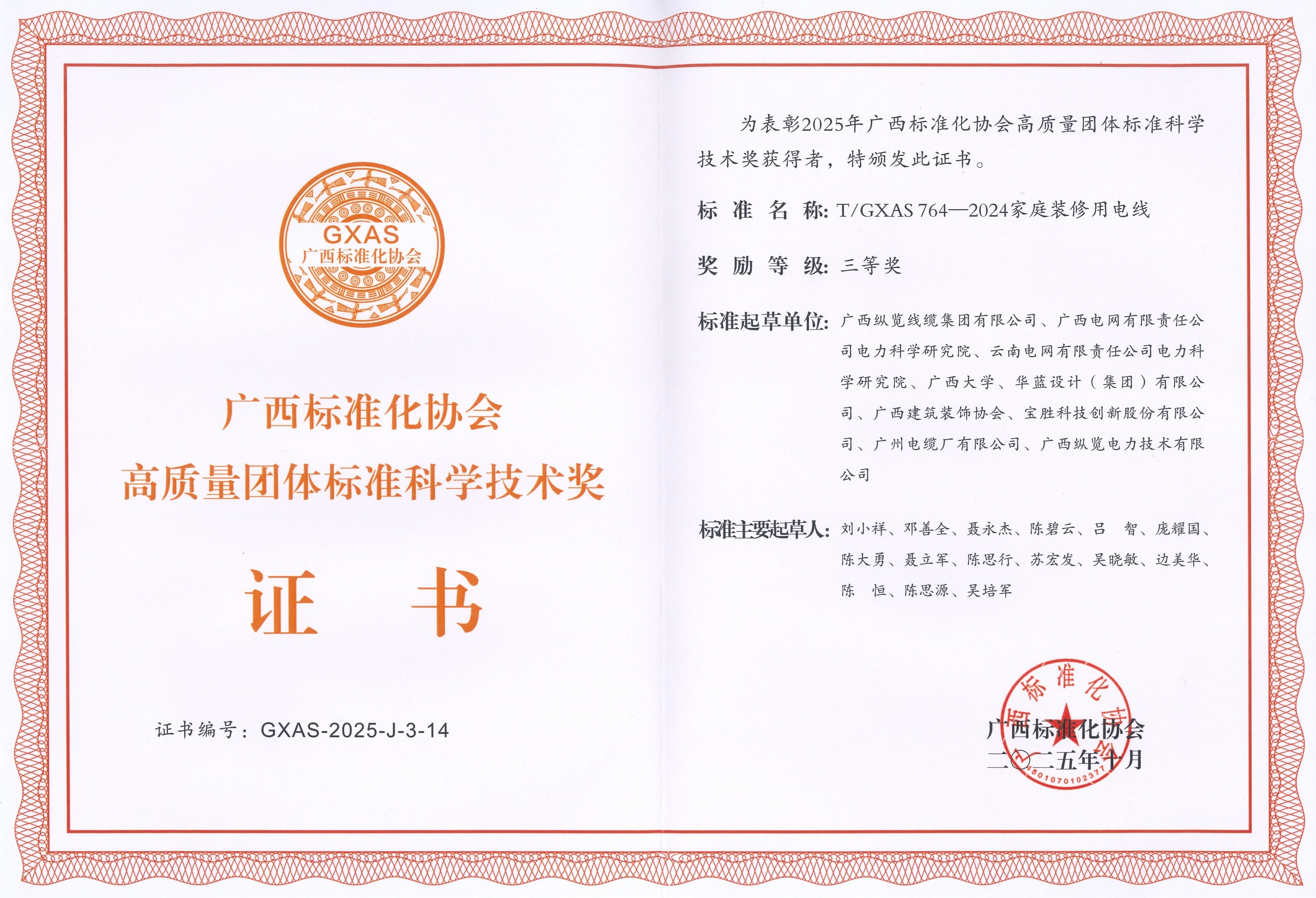 10月9日, 由中國標準化協(xié)會指導,廣西標準化協(xié)會主辦,以及廣西36家協(xié)會/學會承辦的《“八桂科技講壇” 2025年世界標準日宣傳活動暨廣西第二屆高質(zhì)量團體標準科學技術獎勵及學術交流大會》在南寧沃頓國際大酒店順利召開。 由廣西縱覽線纜集團有限公司、廣西電網(wǎng)有限責任公司電力科學研究院、云南電網(wǎng)有限責任公司電力科學研究院、廣西大學、華藍設計(集團)有限公司、廣西建筑裝飾協(xié)會、寶勝科技創(chuàng)新股份有限公司、廣州電纜廠有限公司、廣西縱覽電力技術有限公司9家單位共同起草編制的《T/GXAS 764—2024家庭裝修用電線》榮獲《廣西標準化協(xié)會高質(zhì)量團體標準科學技術獎三等獎》。 《家庭裝修用電線》這一團體標準,由廣西縱覽線纜集團主導編制,全面且細致地規(guī)定了家庭裝修用電線的質(zhì)量要求。該標準的出臺,對確保家庭裝修用電線的質(zhì)量、推動其廣泛應用以及保障家庭用電安全,意義重大。同時,該標準的有效實施,將更好促進家庭裝修用電線生產(chǎn)企業(yè)的技術水平顯著提高,對引領推動家庭裝修用電線高質(zhì)量快速發(fā)展發(fā)揮重要作用。 大會交流期間,公司總工程師劉小祥向中國工程院院士、國際電工委員會(IEC)第36屆主席舒印彪院士等介紹《家庭裝修用電線》標準產(chǎn)品。 此次榮獲獎項,不僅是對縱覽線纜集團在標準化工作領域?qū)I(yè)能力與創(chuàng)新精神的高度認可,更是對其積極履行社會責任、推動電線電纜行業(yè)規(guī)范化發(fā)展所做貢獻的充分肯定??v覽線纜集團始終秉持"做負責的人,做最好的線纜"的企業(yè)愿景,這一榮譽的獲得,將進一步激勵集團在電線電纜標準制定與技術研發(fā)方面持續(xù)投入,不斷提升產(chǎn)品質(zhì)量與服務水平,為家庭用電安全事業(yè)及行業(yè)高質(zhì)量發(fā)展貢獻更多力量。 |