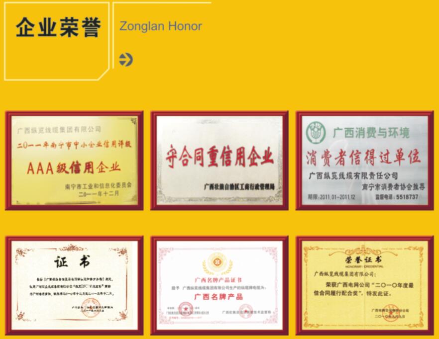 全國電線電纜產(chǎn)品質(zhì)量監(jiān)管AAA級企業(yè)、全國重合同守信用單位、廣西“十二五”電線電纜產(chǎn)業(yè)重點扶持企業(yè)、“廣西著名商標”、